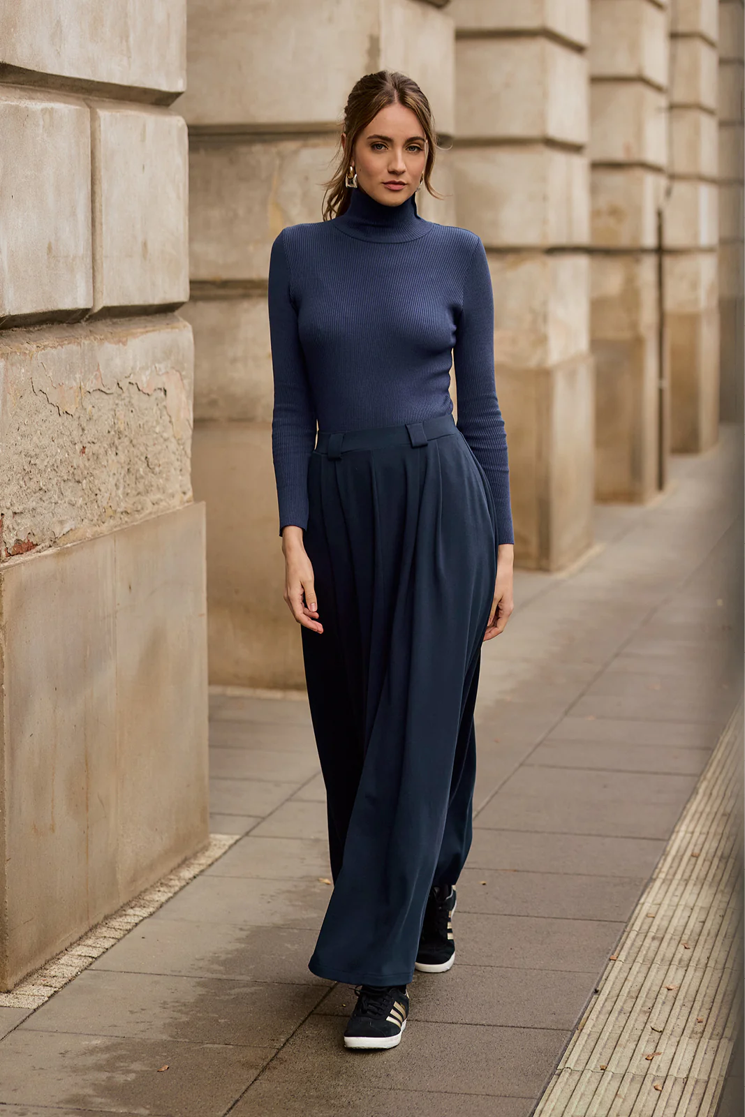Ta granatowa spódnica maxi ma wszystko, czego oczekujesz od garnituru — zawodowy sznyt, szyk i szlufki, które wyznaczają miejsce na Twój pasek. Mimo eleganckiego punktu wyjściowego, lekko oversizowy fason daje dużo luzu i wygody. Ta garniturowa spódnica swoją długość i kieszenie zapożyczyła od ukochanej przez wiele osób Baldresówy. Tyle że o 180 stopni zmieniła charakter. ;)