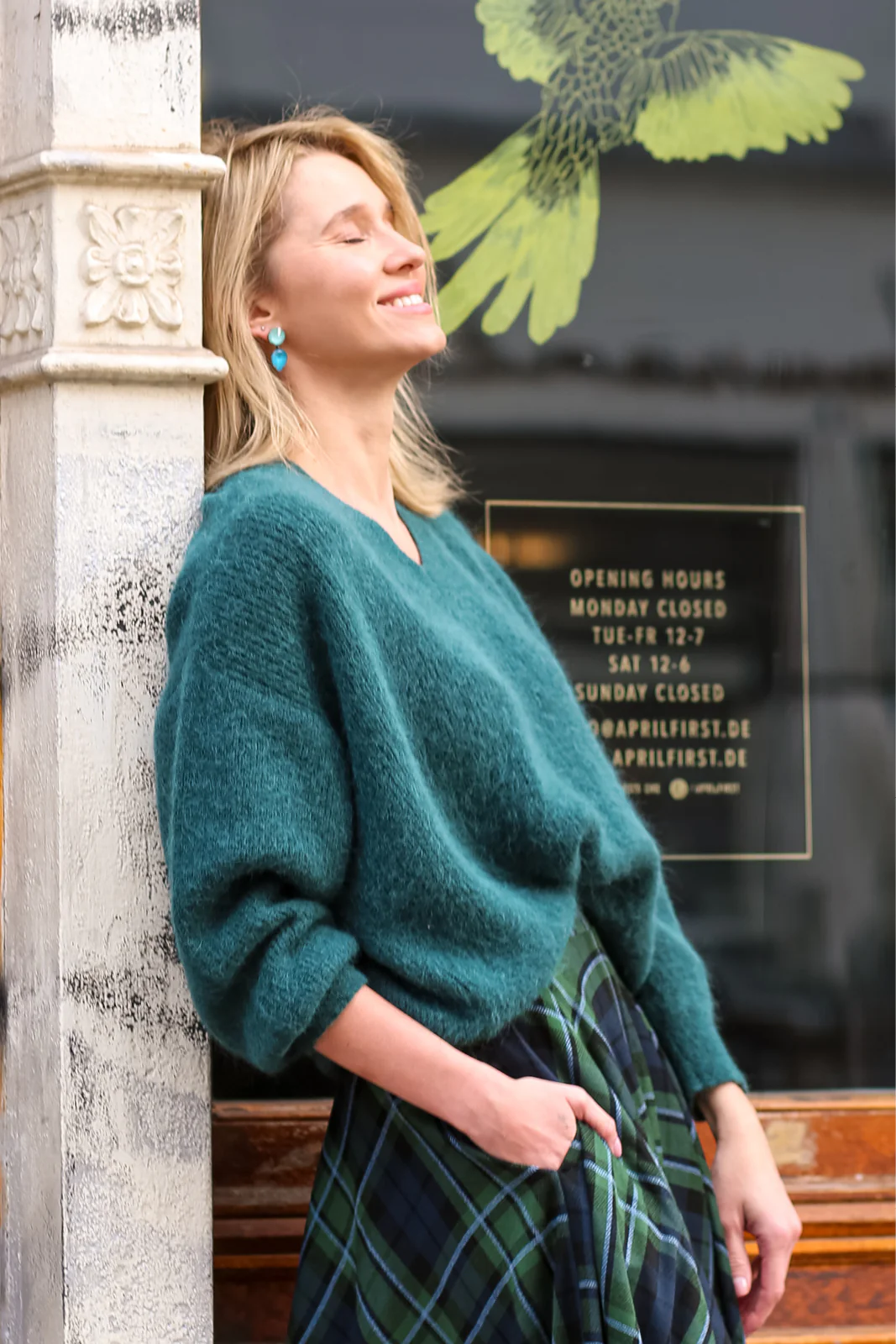 To sweter z linii klasyków: rzeczy, w które inwestujesz i nosisz latami. Oversizowy, przemiły w dotyku, z pięknym dekoltem V i w szlachetnym kolorze butelkowej zieleni. Wyprodukowany w Polsce z drogocennego runa alpak Suri hodowanych w Południowej Ameryce. Ta bardzo rzadka odmiana alpak ma najdłuższy, najbardziej delikatny, jedwabiście gładki, błyszczący włos, który w odczuciu porównywany jest do jedwabiu. Efekt? Ciepły sweter, który nie gryzie. Wręcz odwrotnie – jest przemiły w noszeniu.